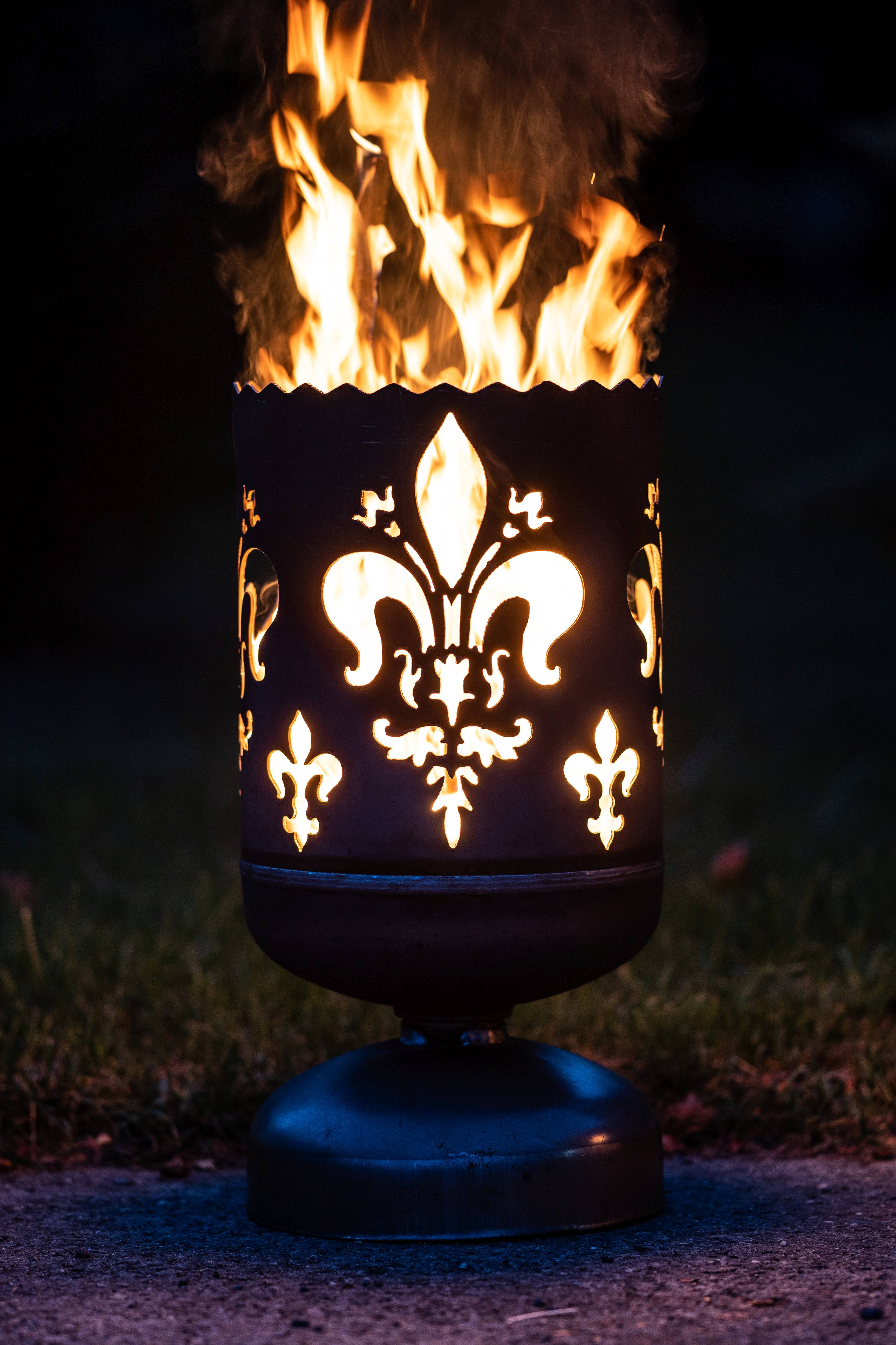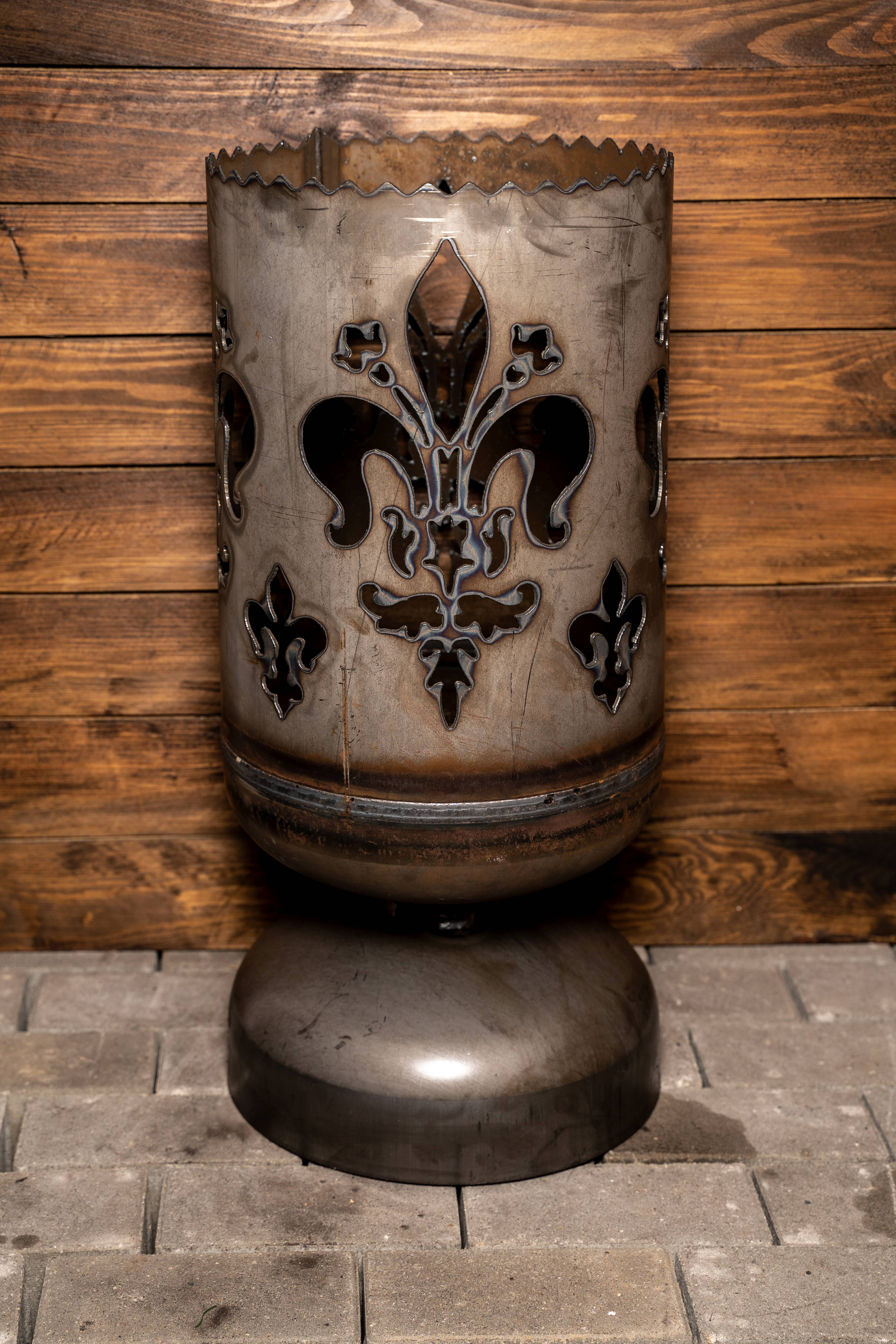 Dieser beschauliche Feuerkorb im Stil der französischen Lilie, hat 4 große und 4 kleine Lilien umlaufend eingearbeitet.