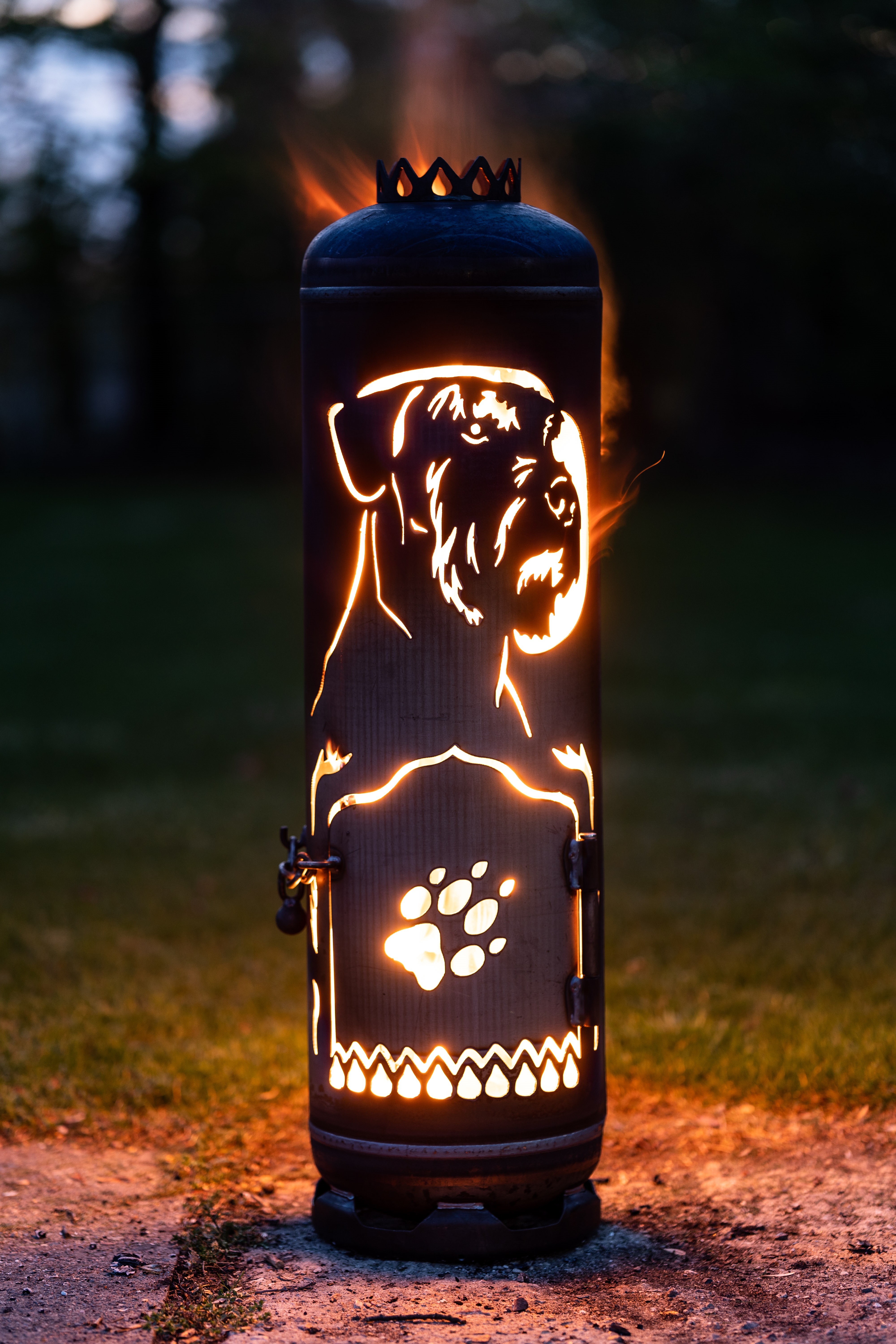 Eine großes Riesenschnauzer-Motiv wurde in die Feuerstelle auf der Rückseite eingeschnitten. Dieses dient mit dem Hundekopf-Motiv und der Hundepfote in der Tür einer optimalen Luftzirkulation für einen effektiven Brennvorgang.