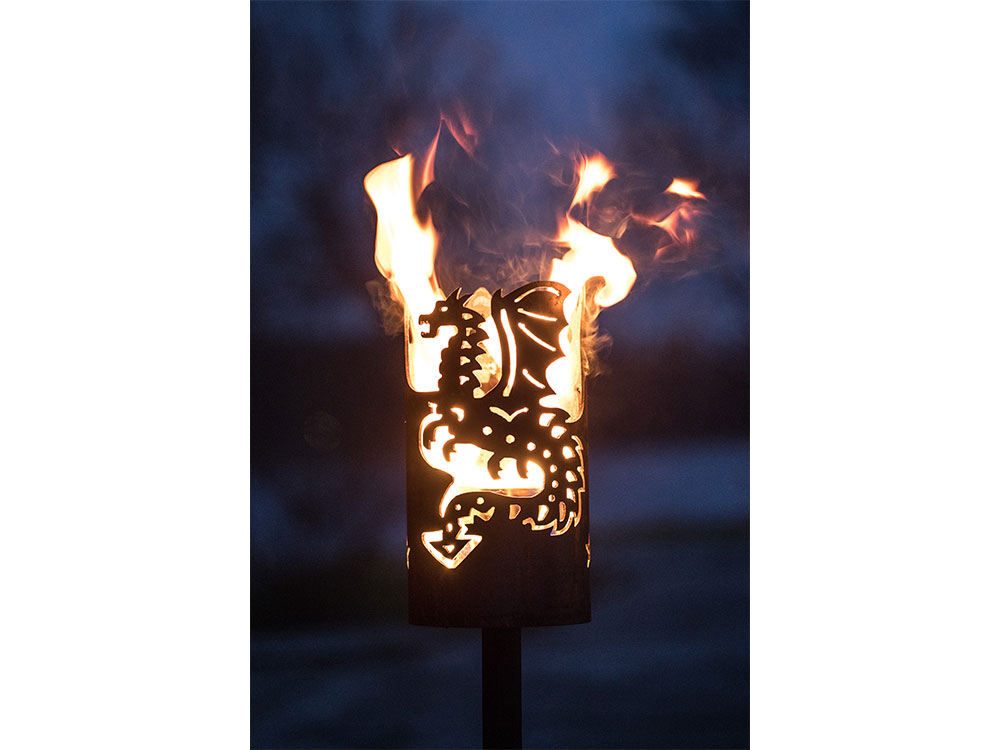 Mit dieser formschönen Motivfackel "Drache mit Zahn" entzünden Sie ein Gartenfeuer, welches Ihrer Umgebung garantiert nicht verborgen bleiben wird!