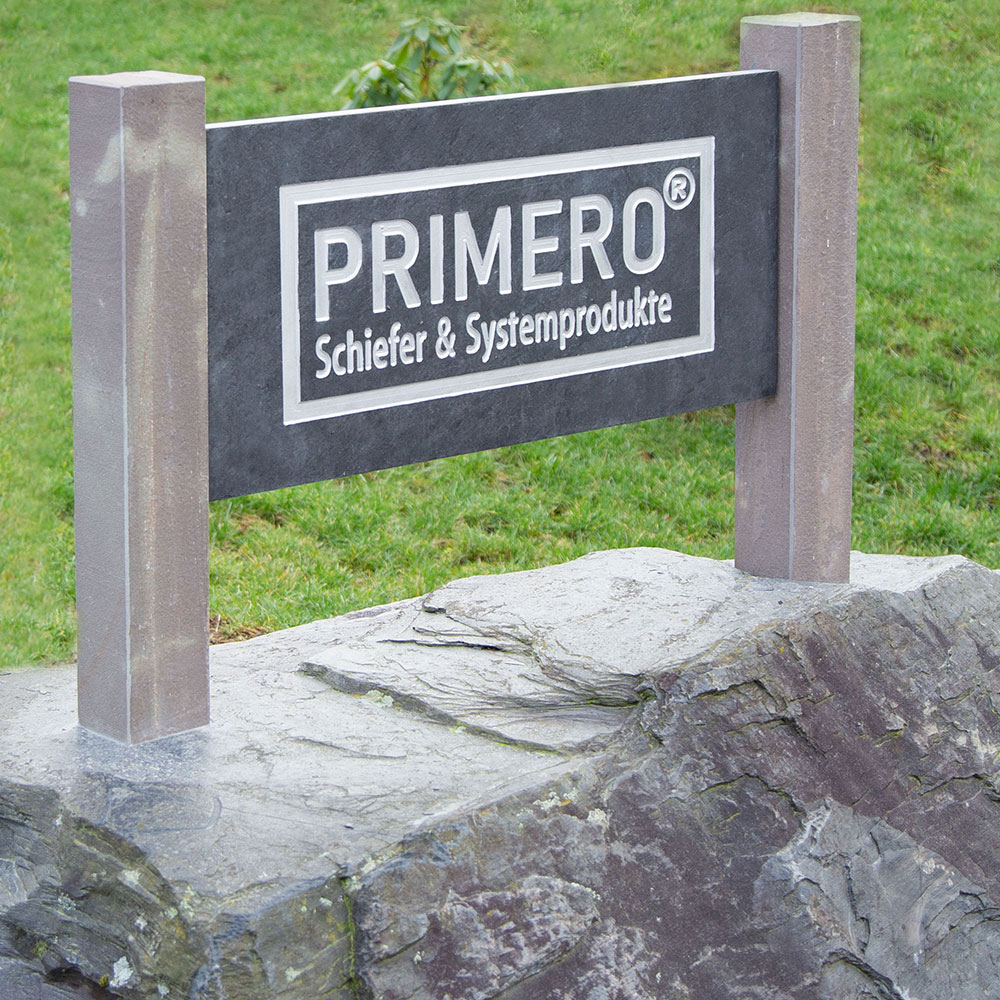 PRIMERO Pilar Firmenschild, ca. 80x40x3 cm, Motiv gefräst/lackiert, Oberfläche geflammt und versiegelt, Kanten geschliffen und gefast, inkl. 2 Grauwacke-Palisaden ca. 100x10x10 cm und VA Befestigungsmittel