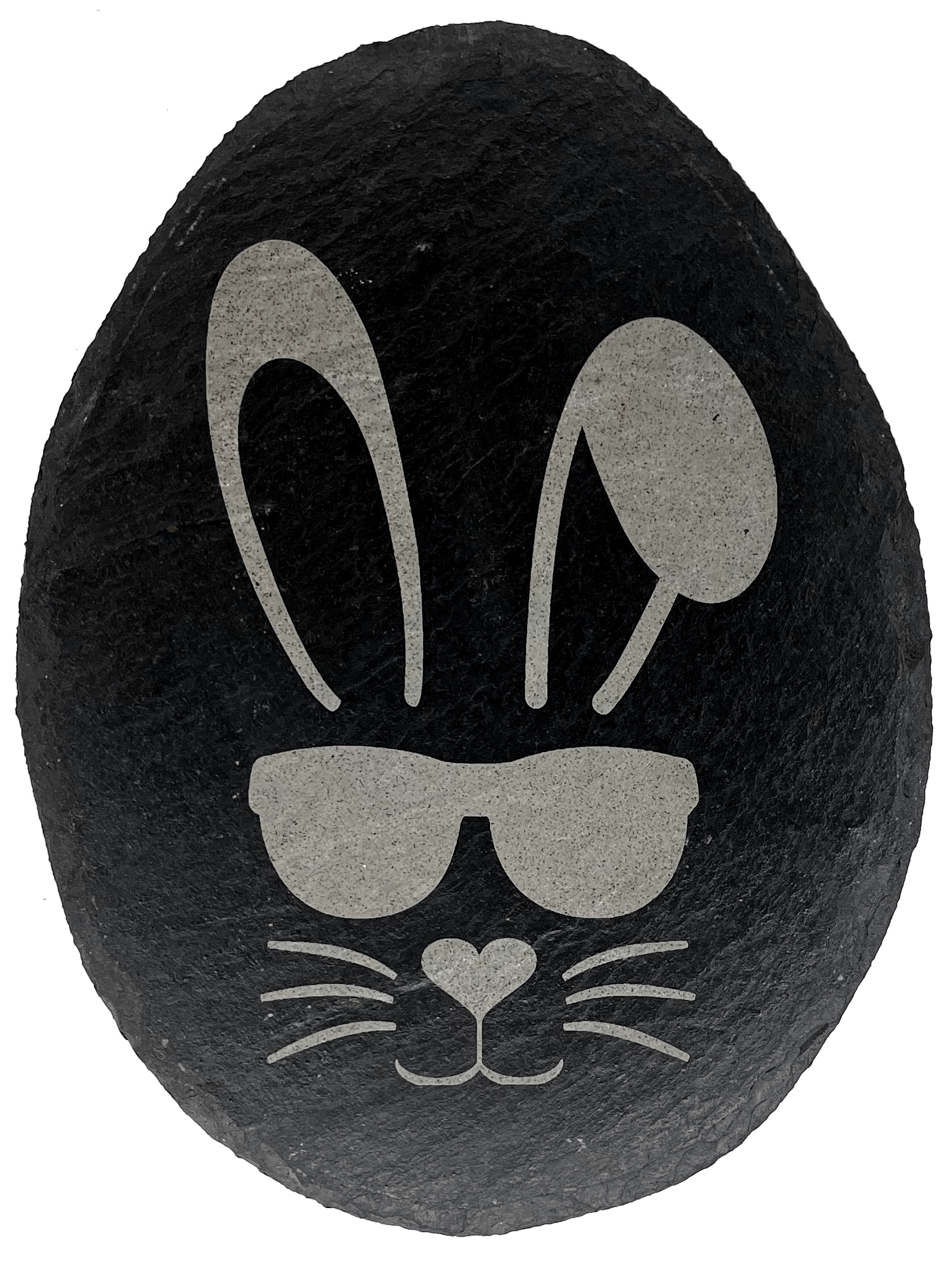 Auf dem Schiefer-Osterei von ca. 18 x 14 cm wurde ein Hasengesicht gelasert. Die Oberfläche des Schiefers ist spaltrau, die Kanten wurden behauen.