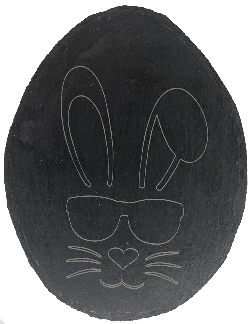 Auf dem Schiefer-Osterei von ca. 18 x 14 cm ist einem Hasengesicht, dessen Konturen gelasert wurden. Die Oberfläche des Schiefers ist spaltrau, die Kanten wurden behauen.