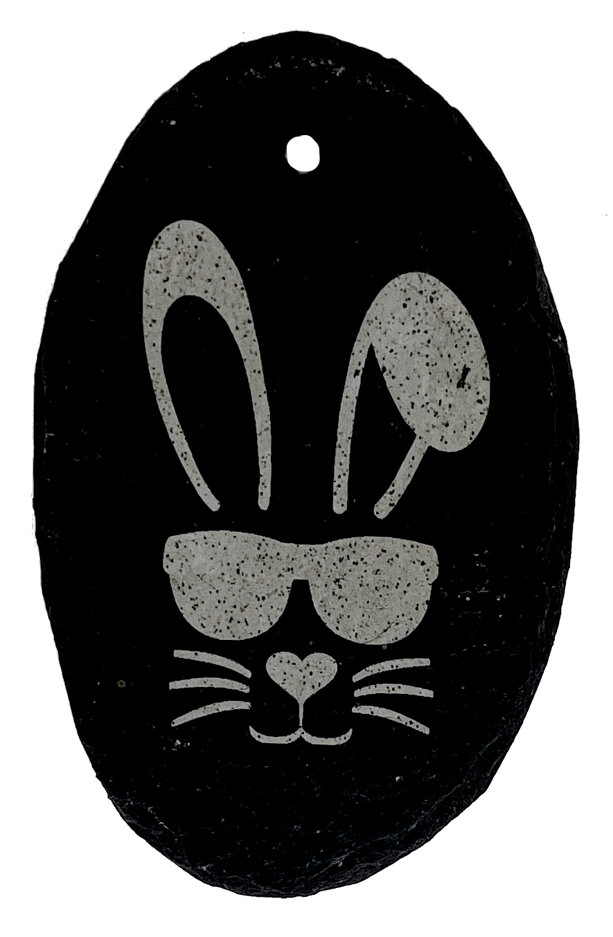 Sie erhalten 4 Schiefer-Ostereier von ca. 8 x 6 cm mit einem Hasengesicht. Die Kanten des Schiefers sind behauen.