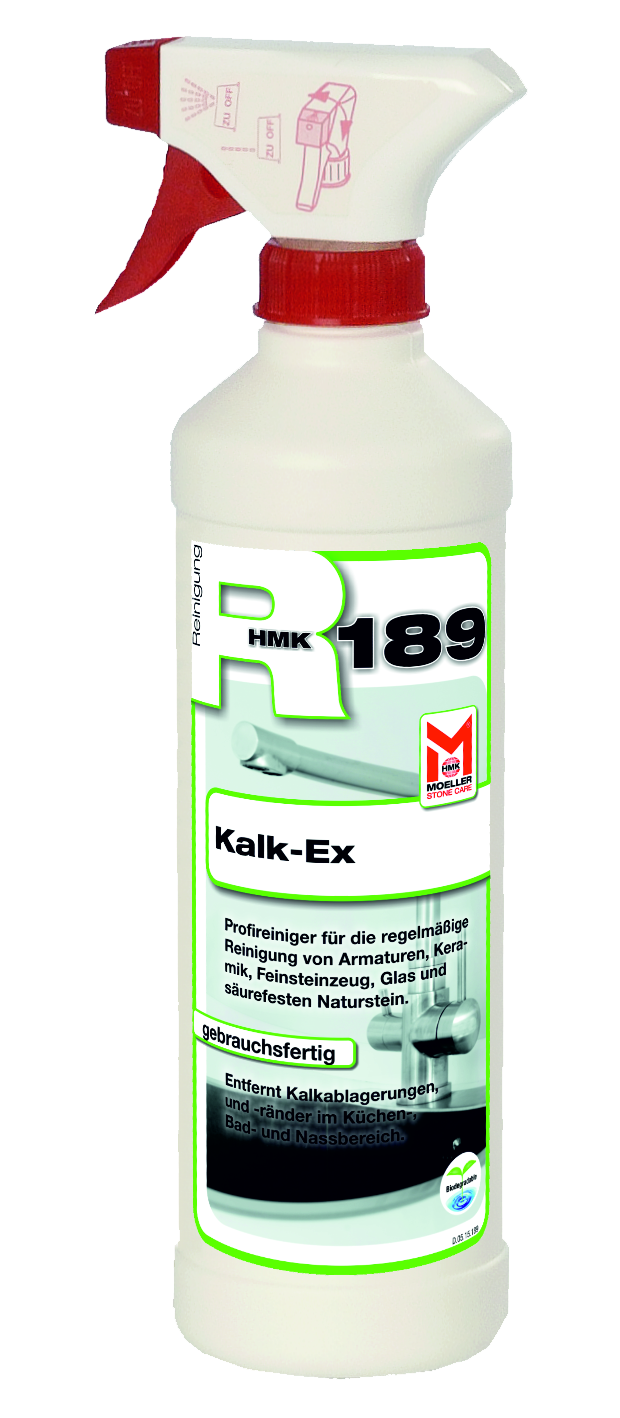 Primero R189 Kalk-Ex ist ein gebrauchsfertiges Reinigungsmittel. Er entfernt Kalkablagerungen, -ränder und Schmutzablagerungen von Armaturen, Keramik, glasierten Fliesen, Feinsteinzeug, Glas und säurefesten Naturstein-Oberflächen in Bad- und Nassbereichen. Verkalkte Oberflächen werden wieder strahlend sauber.