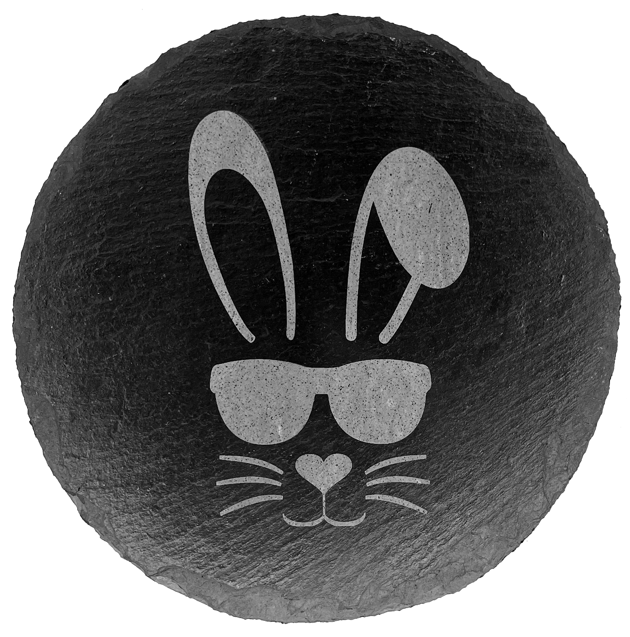 Auf dem für unden Schiefer-Untersetzer von ca. 18 cm Durchmesser wurde ein Hasengesicht gelasert. Die Oberfläche des Schiefers ist spaltrau, die Kanten wurden behauen.