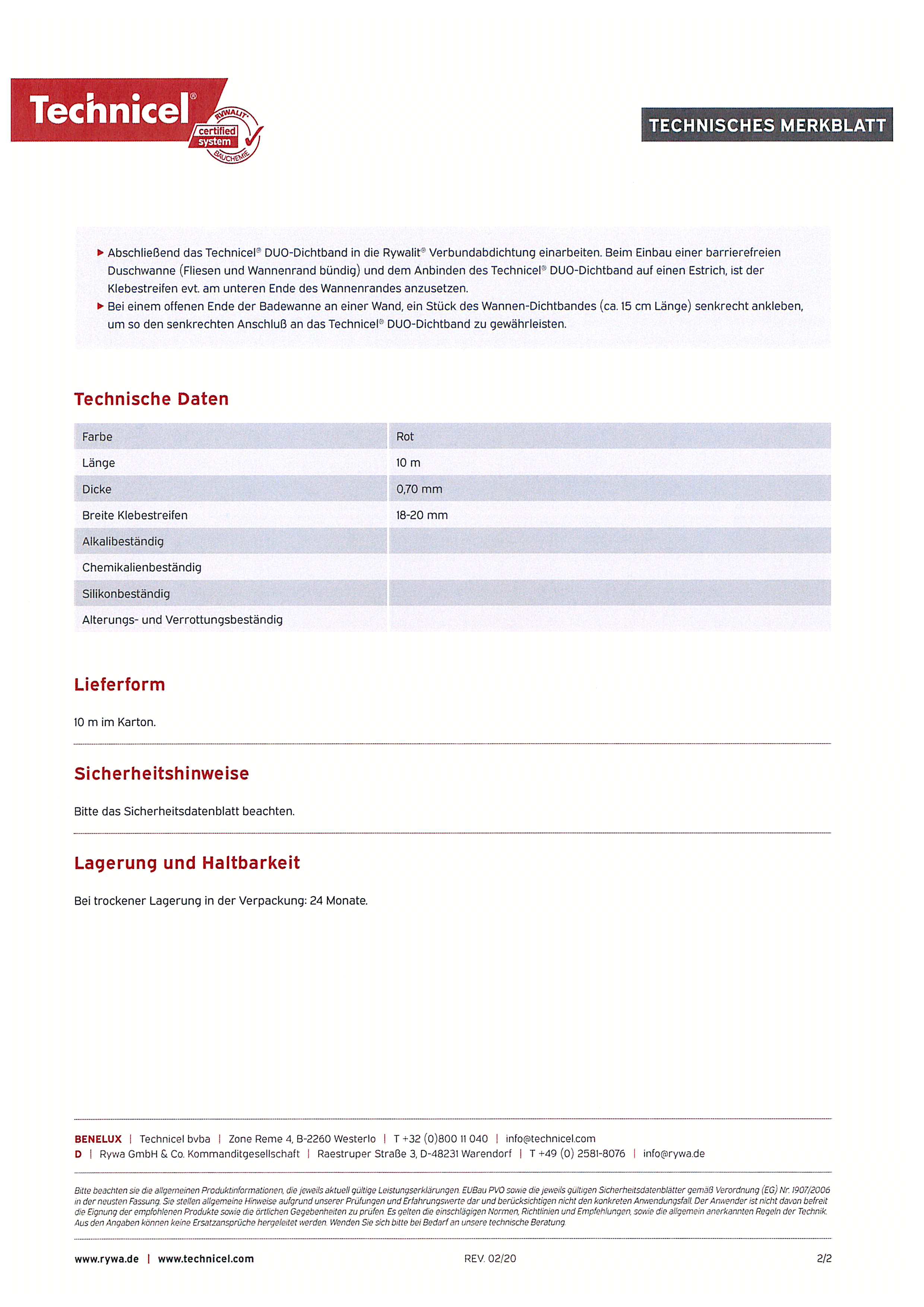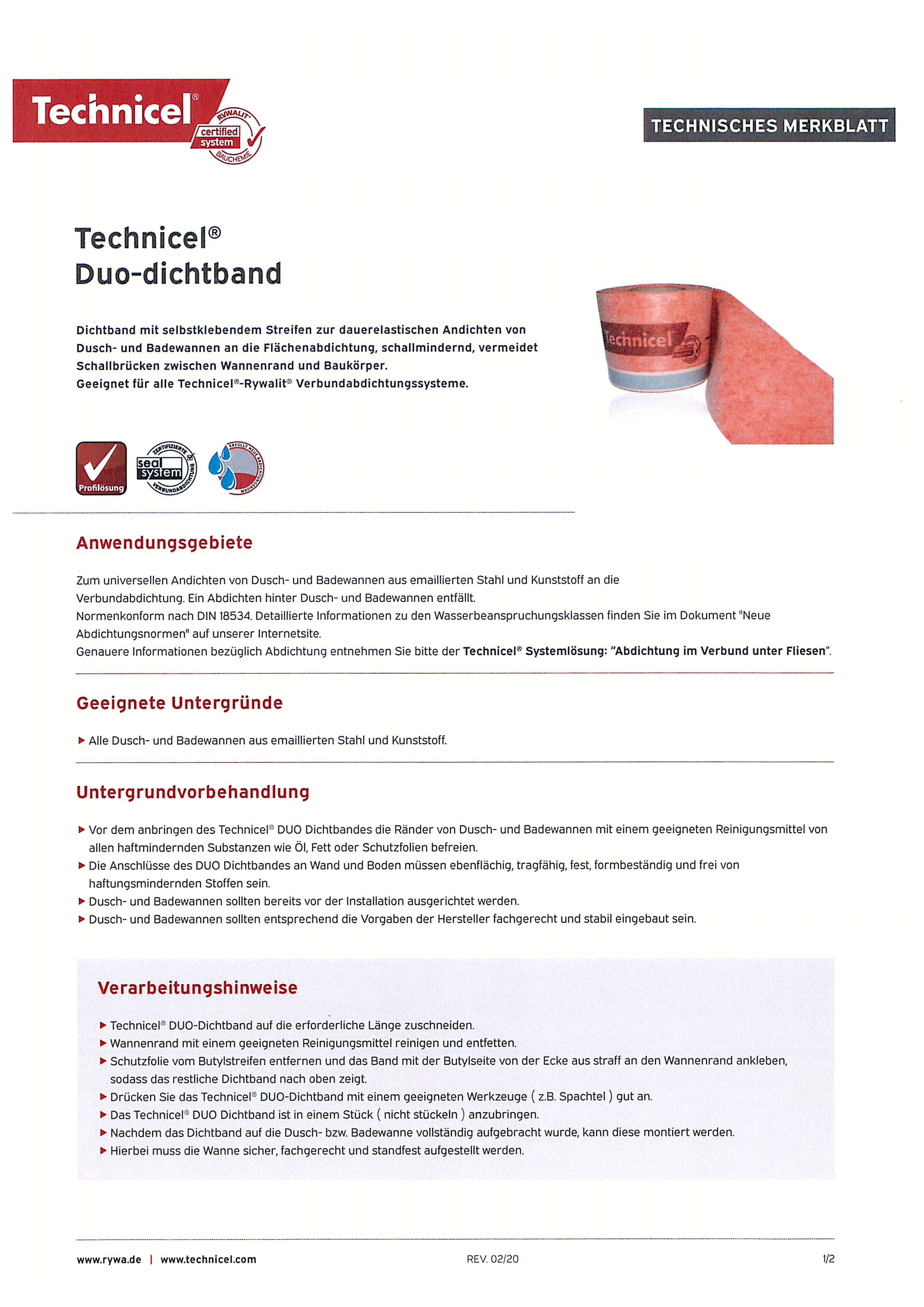 Ein Abdichten hinter Dusch- und Badewannen entfällt. Schallmindernd, vermeidet Schallbrücken zwischen Wannenrand und Baukörper. Geeignet für alle Technicel - Rywalit Verbundssysteme.