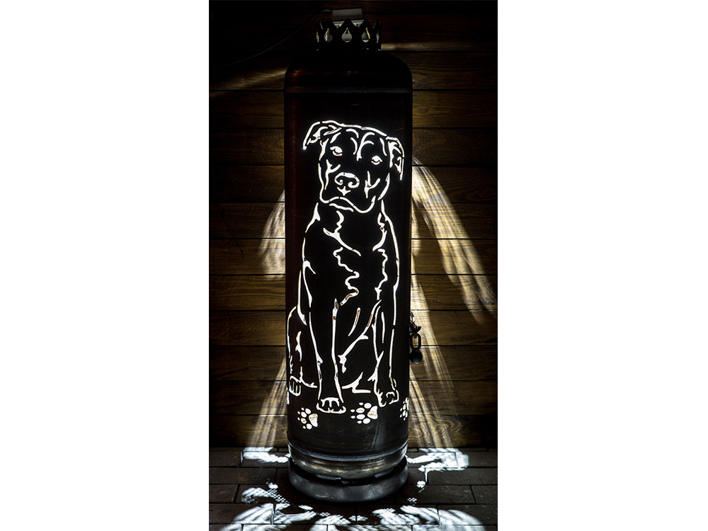 Ein originelles Gartenfeuer mit einer American Staffordshire-Silhouette können Sie wunderbar erkennen, wenn die Feuersäule bei Dunkelheit in Betrieb ist.