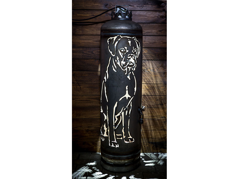 Sie sehen hier als Motiv dieses Terrassenofens einen Boxerkopf, auf der Rückseite einen kompletten Boxer, der Ihre Gartenbeleuchtung in ein wundervolles Flair taucht.