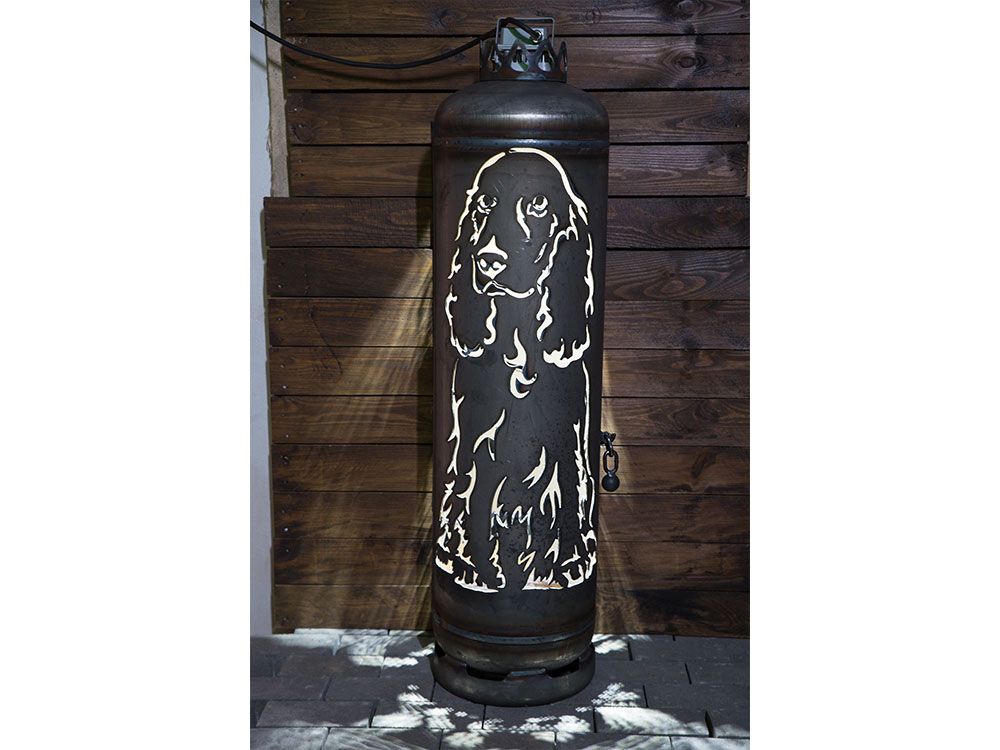 In der Feuersäule wurde vorne ein Cocker Spaniel-Kopf, hinten ein großes Cocker Spaniel-Gesamtmotiv eingearbeitet, welches zugleich einer sehr guten Belüftung beim Brennen dient.
