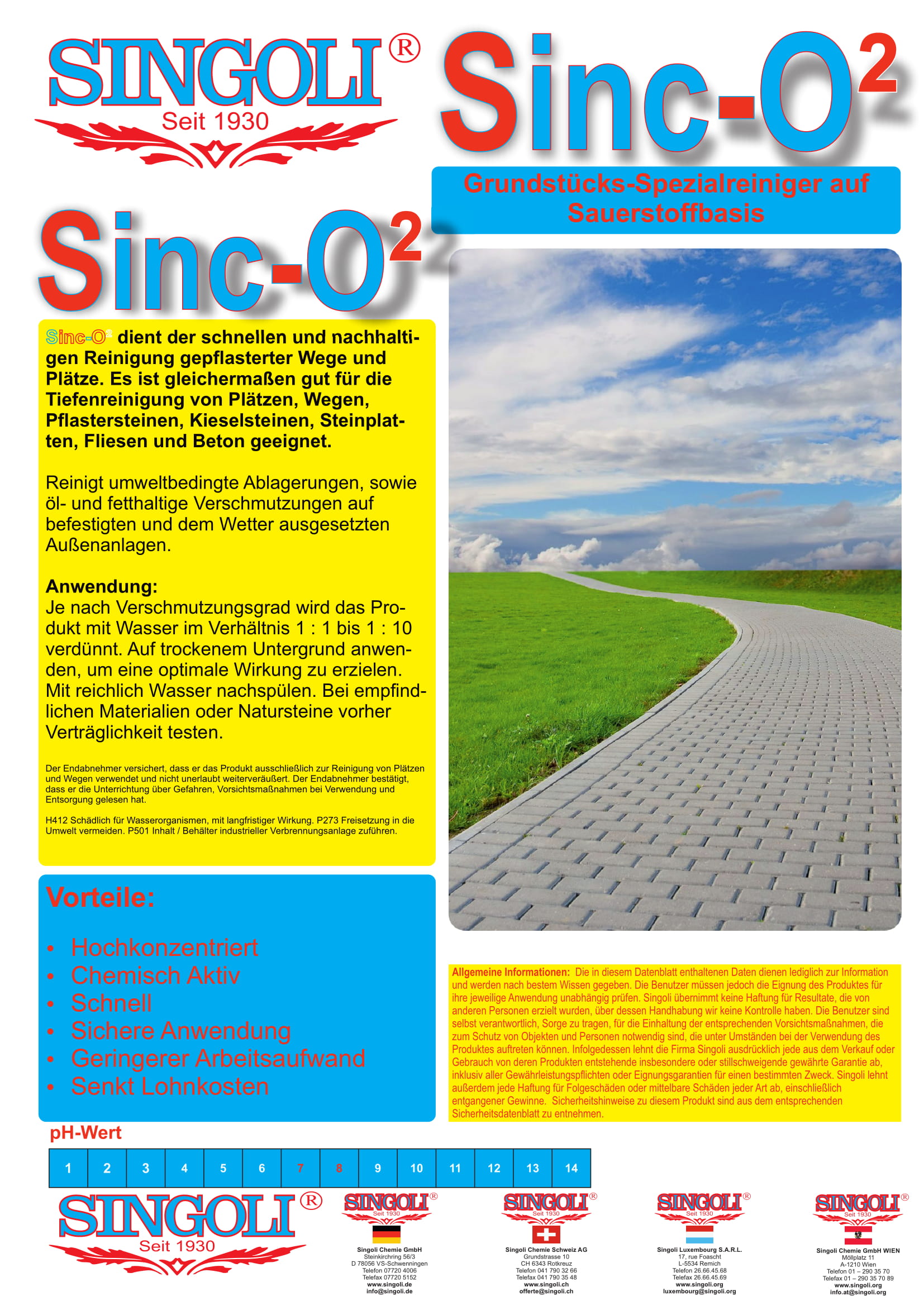 Sinc-O² dient der schnellen und nachhaltigen Reinigung gepflasterter Wege und Plätze. Es ist gleichermaßen gut für die Tiefenreinigung von Plätzen, Wegen, Pflastersteinen, Kieselsteinen, Steinplatten, Fliesen und Beton geeignet.